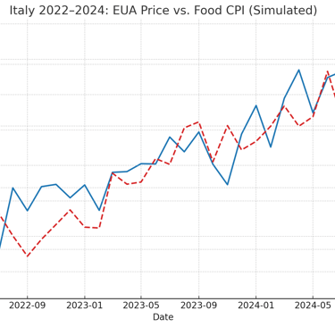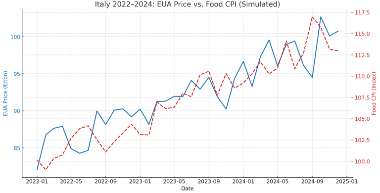 下圖模擬並對比了義大利從 2022 到 2024 年之間的 EUA 均價(€/噸)與食品消費者物價指數(CPI)走勢。