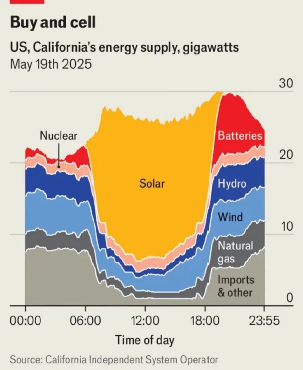 根據當日 CAISO 資料圖,可以看出電網內部正在發生結構性劇變: