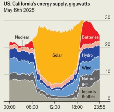 你知道嗎?加州有一整天幾乎一半的用電來自太陽 2025年5月17日,美國加州電力調度中心(CAISO)公布了一項引人注目的資料:在當天整個電網的供電結構中,光伏(太陽能)與儲能合計供應了將近 50% 的總用電量。這不僅是一個數字,更是一個強烈的訊號:再生能源正快速改變傳統發電邏輯,對電力市場與能源政策帶來前所未見的壓力與挑戰。 那麼,當大量太陽能上網,電網真的比較綠、更穩定、也比較便宜嗎?答案沒有想像中簡單。 我們必須誠實問一個問題: 這不是科技落後,也不是資源不足。那問題出在哪裡? 答案是制度與政治的雙重失能。 能源轉型,在台灣,不只是科技工程,它是一場政策協調、行政整合與政治共識的系統戰。而我們在這場戰爭中,幾乎是「從頭打輸到底」。 但實情是: 再多的綠電,沒有儲能,都是白搭。 離峰多、尖峰少,不穩定、不可控——這就是再生能源的宿命。而儲能,是打破這個宿命的關鍵角色。 問題是,台灣的儲能產業,正在一條看不見的封路上停擺。 再不處理,儲能不僅會成為轉型破口,更會成為 全國電力供應的未爆彈。 但真相是——很多建好的綠能,根本發不出電來。 問題不在風,不在太陽,而是我們的電網系統「撐不住」這些電。